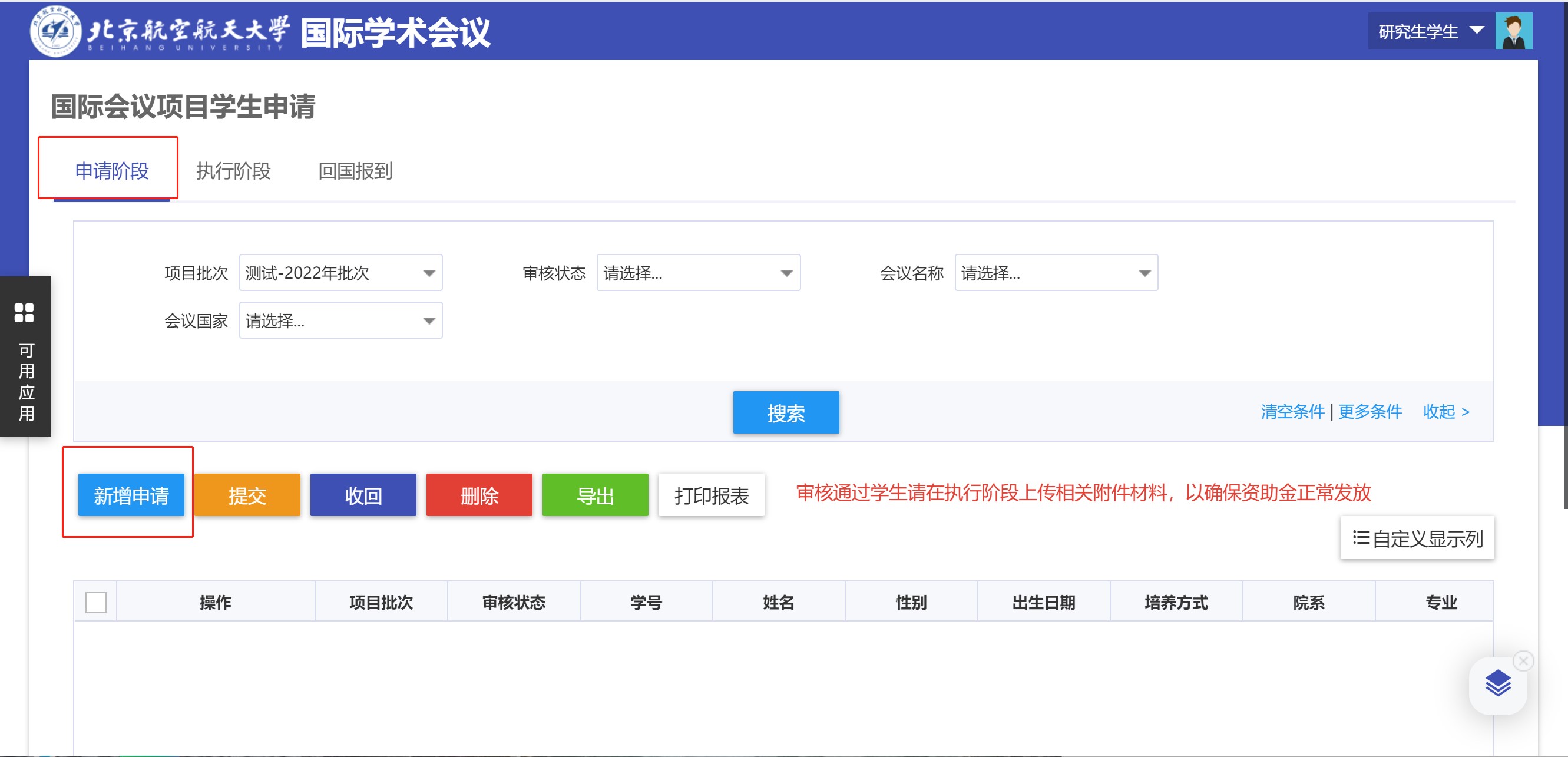 学生账户登陆研究生信息管理系统(gsmis.dienj.com)——培养项目——国际会议资助,进入下面界面后在“申请阶段”点击新增申请,填写或选择个人信息及出国参会的相关信息,并上传附件材料,填写完成后点击提交按钮,完成申请流程。(如下图所示)